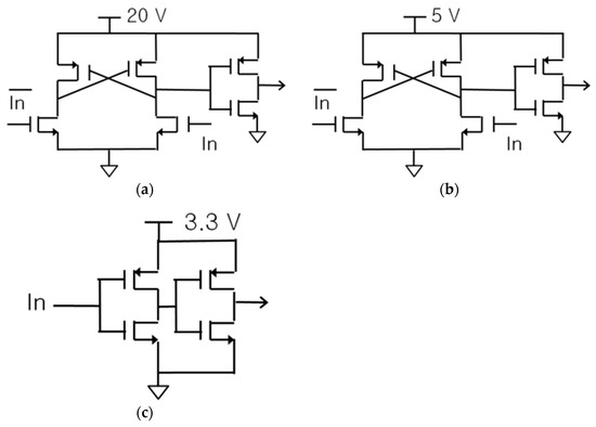 When a thick gate oxide is used in the power amplifier, a gate swing of 20 V is required for the low-side gate driver. Similarly, mid and thin gate oxides require gate voltage swings of 5 V and 3.3 V, respectively. Therefore, in this study, the structure of the low-side gate driver was configured differently to minimize power consumption according to the gate oxide thickness. A thin gate oxide can be configured only in the form of two inverters. This structure was configured by optimizing the size of the device to drive a large capacitance; additionally, it had the lowest static power loss. In the case of the mid-thickness gate oxide, the input of the pulse generator was converted from 3.3 V to 5 V using a simple level shifter. In this case, a cross-coupled structure was used, with the disadvantage that static loss continues to occur. Similar to this structure, in the case of a thick gate oxide, a cross-coupled level shifter was used, which generated a gate voltage swing of 20 V. Figure 2 depicts the proposed structure of the low-side gate driver depending on the gate oxide thickness. Figure 2a,b show a low-side gate driver with a thick and mid-thickness gate oxide, respectively, and have a cross-coupled structure. Figure 2c shows a low-side gate driver in thin gate oxide and has an inverter structure. Although the level shifter structure has the advantage of being able to generate a high voltage easily, it has the disadvantage of exhibiting static power loss. An optimal structure based on the operating voltage is proposed in Figure 2. “In” signal indicates the input voltage from the pulse generator. In the case of the low-side gate driver, the voltage swing has a large difference; therefore, it significantly affects PG.