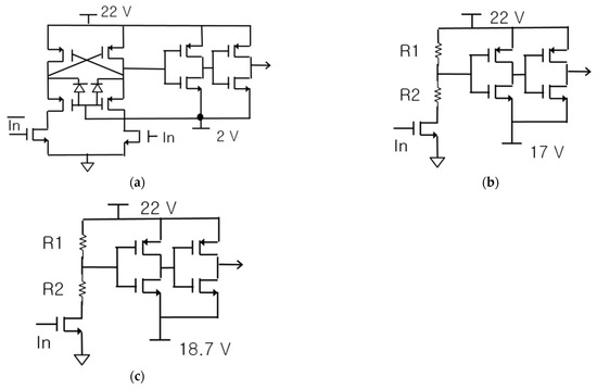 The configuration becomes more complicated in the case of a high-side gate driver. To drive the power transistors of the PMOS, a gate swing from 22 V to 2 V, from 22 V to 17 V, and from 22 V to 18.7 V should be made for thick-gate oxide, mid-gate oxide, and thin-gate oxide devices, respectively. In the case of the thick gate oxide, a structure similar to the previous one was used for comparison [31]. When designing a high-side gate driver, a cross-coupled structure similar to that of a level shifter was used. “In” signal indicates the input voltage from the pulse generator. In this case, a cross-coupled structure was used and static loss occurred. The inverter structure at the backstage was used to drive a high capacitance and generate the desired voltage for a high-side gate driver. The average power consumption of this gate driver was 13.87 mW (Figure 3a). However, note that when the same structure is used for mid or thin gate oxides, the power transistor pMOS in the full-bridge structure does not turn on. This is because the gate voltage swing difference for the turn-on and turn-off of the pMOS power transistor is too small in mid and thin gate oxides. To prevent this in the case of mid and thin gate oxides, the high-side gate driver was configured in the form of a voltage divider using resistors (R1 and R2). In this case, similar to the cross-coupled structure, static loss occurs; however, this loss can be minimized by increasing the resistance (Figure 3b,c). High resistance can increase the turn-on delay; therefore, an optimization process is required. Thus, the total gate loss became approximately 12.61 mW for the mid gate oxide and 9.44 mW for the thin gate oxide. In the case of a high-side gate driver, the reduction in the gate voltage swing does not have a significant effect on power reduction. The voltage divider structure enables a simple configuration and fast switching speed; therefore, it can have a switching delay within 2 ns. Essentially, the switching voltage range is very important for the structure of a high-side gate driver. When the switching voltage range is large, the cross-coupled structure is advantageous in speed and power consumption. When the switching voltage range is small, the voltage divider structure is advantageous in speed and power consumption.