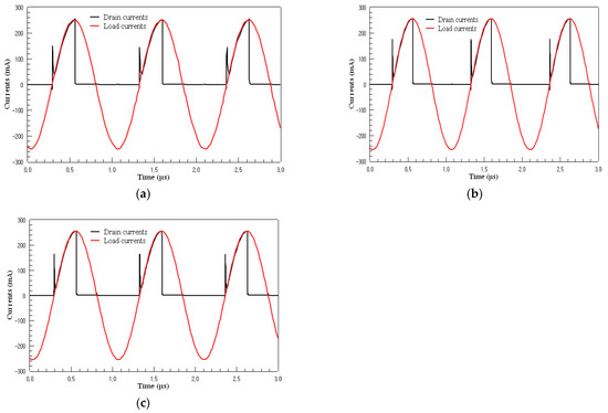 where IDS is the drain current between the source and drain during the on state, which is not constant. For an accurate comparison, the total area of the power amplifier was fixed at the same value because Rds,on can be reduced in proportion to the total area. In the case of thick-gate oxide devices, the approximate values of Rds,on, Pconduction, and PS were 4.5 ohm, 32.8 mW, and 0.64 mW, respectively, for one transistor. Each PS for various gate oxide thicknesses can be calculated by integrating the currents during switching times. Figure 4 shows the waveforms of the drain currents for the high-voltage pMOS. The load currents are also shown for better understanding. Evidently, the peak load currents were slightly higher for the thin-gate oxide devices. In the case of mid-gate oxide and thin-gate oxide devices, the approximate values of Rds,on, Pconduction, and PS were 3.5 ohm, 23.92 mW, and 0.32 mW; and 3.5 ohm, 24.1 mW, and 0.36 mW for one transistor, respectively. These values were similar for high-power nMOS and pMOS. Under a similar VDS, as depicted in Figure 4, the main factor for reduced Pconduction in mid- and thin-gate oxide devices is the reduced Rds,on.