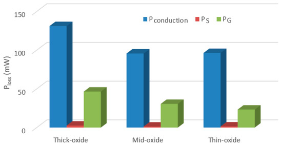 The power consumption with load for low-side gate drivers using thick, mid, and thin gate oxides was 7.89 mW, 1.17 mW, and 0.69 mW, respectively. In the case of low-side gate drivers, a low gate voltage swing has a significant advantage in terms of power consumption. Because two drivers are used for the low side-gate driver, they consume twice the power mentioned above.