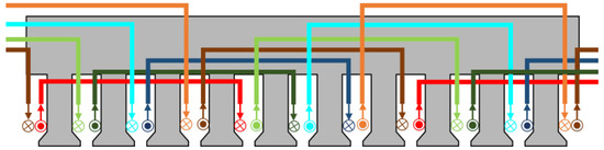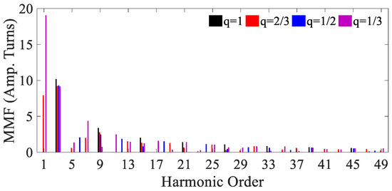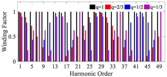 According to the value of q in Table 2, four concentrated winding patterns and selected Ns values as shown in Figure 2, Figure 3, Figure 4 and Figure 5 are considered. The corresponding winding factor and winding harmonics of each q are presented in Figure 6 and Figure 7, respectively.