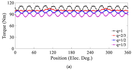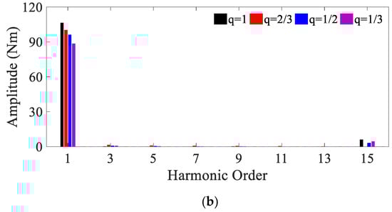 As shown in Figure 9a, the greater the value of q, the more average torque is produced by the proposed 7-P SPMSM. As a result, according to torque FFT analysis shown in Figure 9b, the amplitude of the fundamental harmonic increases as q grows.