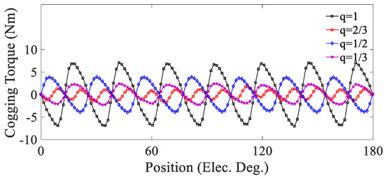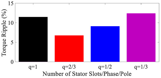 Based on TCog results, illustrated in Figure 10, the cogging torque does not follow the same path the average torque did, thus, the growing value of q does not directly affect TCog. This means, for q = ⅓ and ⅔, the peak-to-peak cogging torque is approximately 50% less than q = 1 and ½, respectively, where q = ⅔ presents the lowest TCog (less than 2 Nm).