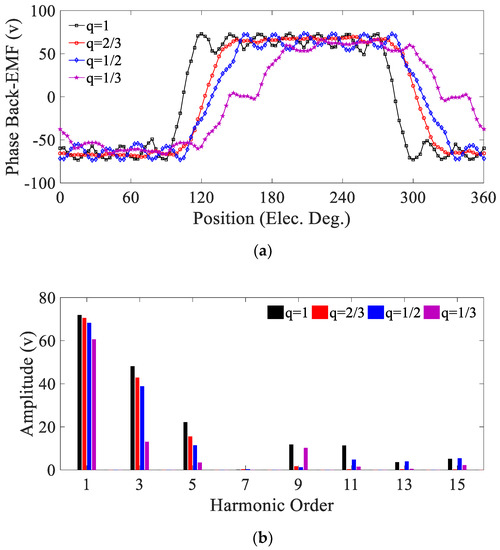 The one-phase back-EMF and the corresponding FFT analysis results of the proposed models are presented in Figure 12a,b, respectively. Accordingly, the peak value of the phase back-EMF increased along with the increasing value of q, from 50 V to 70 V for q = ⅓ to q = 1, respectively. The amplitude of harmonics for q = ⅔ continuously decreased to about zero for n ≥ 7th harmonic, whereas other q values suffer from n > 7 harmonic orders. Thus, the phase back-EMF, produced by the q = ⅔ model, presents fewer fluctuations with desirable peak values.