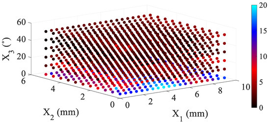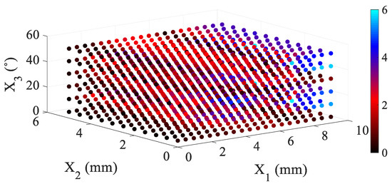 As depicted in Figure 8, the analysis variables, namely X1, X2, and X3, are sensitively analyzed for the candidate model from Section 4.1, considering the constraints in the objective function. Torque, cogging torque, and torque ripple results of this sensitivity analysis are illustrated in Figure 13, Figure 14 and Figure 15. As depicted in Figure 13, decreasing value of X1 and X2 along with an increase in X3 value increases Tavg, so that Tavg-Max produced equals 96.2 Nm for X1 = 2.5 mm, X2 = 3.5 mm, and X3 = 45°. TCog results are illustrated in Figure 14, where X1 and X2 should move in opposite directions in order to provide lower cogging torque. For X3, TCog fluctuates in the way that the lowest TCog produced is 0.018 Nm as X1 = 0 mm, X2 = 5 mm and X3 = 5°. Lower TRipple is presented by increasing values of X2 and X3, where X1 causes fluctuations in torque ripple. However, TRipple-Min is provided by values of X1 = 0 mm, X2 = 4.5 mm and X3 = 45°, which equal to 1.7%. Based on the results shown in Figure 13, Figure 14 and Figure 15, and resultant values for X1 to X3, the best-performing models are categorized. They are those which provide maximum average torque (Model-I), minimum cogging torque (Model-II), and minimum torque ripple (Model-III), respectively. Corresponding results for the optimized models are reported in Table 3.