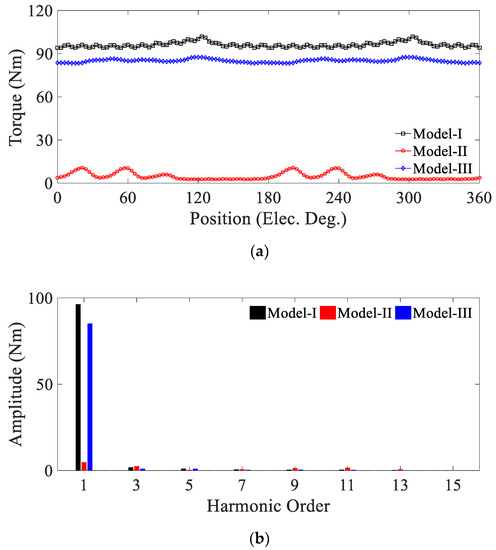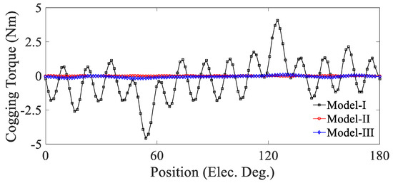 It can be obtained from Figure 16a,b that the Model-II presents poor torque density. However, it produced TCog close to zero which is desirable. The Model-I provides the highest electromagnetic torque, whereas it suffers from high fluctuations in comparison with the Model-III, visiting the objective function constraints (Tavg ≥ 80 Nm) with low pulsations.