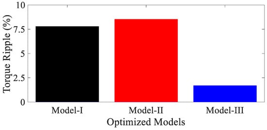 Accordingly, TCog and TRipple are depicted in Figure 17 and Figure 18 respectively, where the Model-III produced significantly low pulsations in comparison with other models and the initial q = ⅔ configuration, as desired in the objective function (TCog ≤ 1 Nm and TRipple ≤ 5%). Meanwhile, Model-I and –II present the highest TCog and TRipple, respectively.