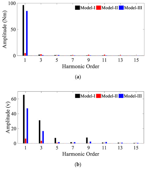 Figure 19a,b demonstrates the phase back-EMF and corresponding FFT analysis of the proposed models in Table 3. It can be determined that in comparison with the candidate model, the amplitude of phase back-EMF harmonics in the Model-I to -III faced a noticeable reduction. Although the phase back-EMF amplitude is low in the Model-II and -I, containing higher harmonics amplitude and even suffers from 9th harmonic order, the Model-III produces an acceptable peak-to-peak phase back-EMF value of 67.2 V with lower amplitude harmonic orders, damped for n ≥ 5th harmonic.