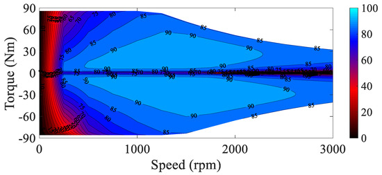 As shown in Figure 20 in terms of the efficiency map of the Model-III, considering Motoring (M) and Generating (G) modes of operation, constant torque region is provided with up to 1500 rpm of speed and with 85 Nm of torque. When in generating mode, a wider region of high efficiency is determined. Hence, constant torque above 80 Nm with an efficiency value of 80% is achievable when speed ≥ 900 rpm in M operation and speed ≥ 1100 rpm in G mode. However, efficiency ≥ 90% is provided for 500 ≤ speed ≤ 2200 and 500 ≤ speed ≤ 2500 rpm in M and G mode respectively, producing at most 60 Nm of average torque.