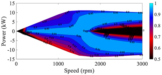 Based on the Model-III power factor (PF) map illustrated in Figure 21, a higher power factor (above 0.7) is determined for P ≥ 5 kW. As shown in Figure 21, for both M and G modes of operation, unlike the constant torque region, PF is increasing along with an increase in P for the constant power region. Conversely, in the constant torque region it declines from 0.99 to 0.7 and 0.5 in M and G mode, respectively, while in the constant power region it reaches from 0.15 to above 0.8 for both M and G operational modes.