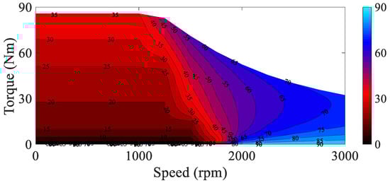 Figure 22 demonstrates the corresponding phase advance (PA) analysis results for the M mode of the Model-III. Accordingly, for 0° ≤ PA ≤ 35° a constant torque region is provided, where speed ≤ 1500 rpm and TAvg ≤ 85 Nm. The constant power region is achieved for 35° ≤ PA ≤ 90° for speed values above 1500 rpm, providing average torque below 80 Nm.