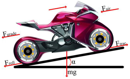 Rolling resistance, defined as Froll, occurs due to interaction between the surface of tires and road surface. Froll is proportional to vehicle mass (m), gravity acceleration (g), road gradient (α), and a rolling coefficient (Cr):