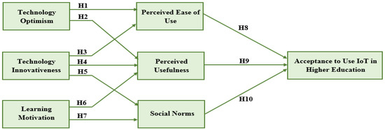The variables of TAM, including perceived ease of use, perceived usefulness, and subjective norms, have a close relationship with technology innovativeness and technology optimism. Previous studies have shown that subjective norms have a positive impact on technology optimism and innovativeness, which are part of students’ personal characteristics [41,42,43,44]. Technology usage beliefs can also be influenced by academics and classmates in an academic setting. A student will likely develop a positive view of a specific technology if their immediate circle of academics and peers has a positive opinion of it. In the same vein, students will likely perceive themselves positively if they are prepared to use the technology. In the early stages of the technology’s adoption, students are willing to be pioneers in the use of advanced technologies. Additionally, an individual’s optimism about technology is associated with the degree to which the individual has pioneered the use of the technology [45,46,47,48]. Similarly, technology optimism can impact students’ attitudes remarkably. Students who are ready to explore new technologies are more willing to accept IoT. New technologies rarely seem complicated or beyond the understanding of technology pioneers. Moreover, users who are denied the opportunity to experiment with new technologies are likely to regret it later [49]. Therefore, the following hypotheses are proposed: