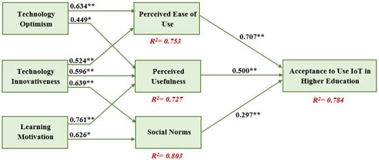 In Table 7, the beta (β) values, t-values, and p-values for all of the developed hypotheses are described on the basis of the produced findings with the help of the PLS-SEM technique. The results supported each hypothesis. Taking into consideration the data analysis hypotheses, the empirical data indicate support for H1, H2, H3, H4, H5, H6, H7, H8, H9, and H10. Technology optimism (TO) and technology innovativeness (TI) had significant effects on perceived ease of use (PEOU), with (β = 0.634, p < 0.001) and (β = 0.524, p < 0.001), respectively. Thus, H1 and H3 are supported. The results also indicate that perceived usefulness (PU) significantly influenced perceived technology optimism (TO) (β = 0.449, p < 0.05), technology innovativeness (TI) (β = 0.596, p < 0.001), and learning motivation (LM) (β = 0.761, p < 0.001), thereby supporting the hypotheses H2, H4, and H6, respectively. The relationships between technology innovativeness (TI) and learning motivation (LM) was found to have significant effects on subjective norm (SN), with (β = 0.639, p < 0.001) and (β = 0.626, p < 0.05), respectively. Hence, H5 and H7 are supported. Finally, the relationships between perceived ease of use (PEOU), perceived usefulness (PU), and subjective norm (SN) were found to have significant effects on intention to use the IoT (BI) (β = 0.707, p < 0.001), (β = 0.500, p < 0.001), and (β = 0.297, p < 0.001), respectively. Hence, H8, H9, and H10 are supported.