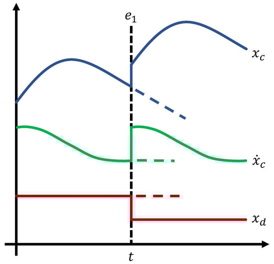 To optimize simulation performance, fast physical effects, such as the change from stick- to slide-friction or the firing of an electrical diode, are often modeled in a discontinuous way. This means that the expressions of the right-hand side of the ODE model may change depending on the current system state and time, and this transition is discrete. Inside the FMI, this means ME-FMUs may contain state- or time-dependent discontinuities, which are triggering so-called events. The actual event’s time point, or the instant at which the equations and/or the state of the model is modified, is defined by a predefined time point itself (time events) or the zero-crossing of a scalar value (state-events), which is also called the event indicator. For a detailed overview of event definition and handling, see [13]. Basically, any ME-FMU with a continuous state , discrete state and time- and/or state-events can be seen as a discontinuous ODE, as shown in Figure 1. Continuous states may change in time, while discrete states can only change their value at event instances.