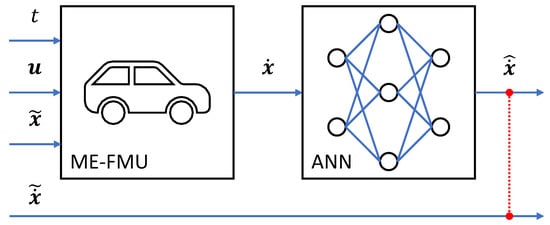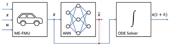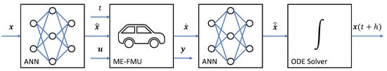 We expand the concept of NeuralODEs by one or more FPMs in the form of FMUs to obtain a class of hybrid models, named NeuralFMUs [9]. Using the example of an ME-NeuralFMU, the ME-FMU replaces the ANN of the NeuralODE because it calculates the system dynamics based on the current system state . To optimize the system state, an additional (state) ANN can be placed before the FMU, and, to manipulate the system dynamics, an additional (derivative) ANN can be placed after. This exemplified structure of a NeuralFMU is given in Figure 3.
