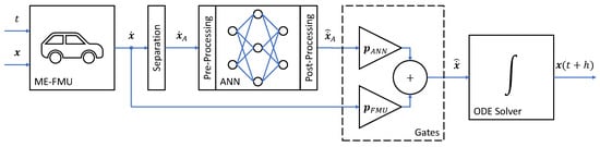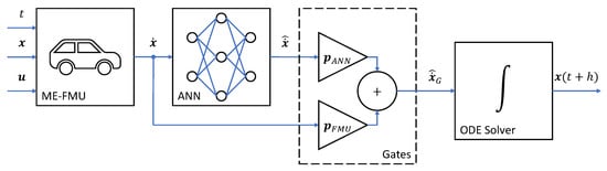 ME-NeuralFMU with FPM/ANN gates: The ME-FMU receives the current time t and state from the numerical ODE solver together with an external input and computes the corresponding state derivative . Two gates and scale how many dynamic changes by the ANN and the FMU are introduced to the derivative vector . Finally, the derivative vector is passed to the ODE solver with the (adaptive) step size h and integrated into the next system state .