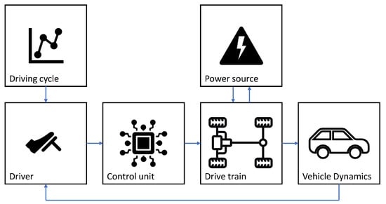 In this section, the used FMU model is introduced. The model represents the longitudinal dynamics of an electric Smart EQ fortwo and is an adaption of a model from the Technical University of Munich [31]. In automotive applications, longitudinal dynamics models are often used to simulate energy consumption; thus, only the related effects are represented in the model. The original model was created in MATLAB®/Simulink®, replicated analogously in the modeling language Modelica® and exported as an FMU. The following Figure 8 shows the topology of the simulation model. The full vehicle model is modular and consists of six core components [32].