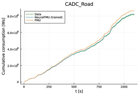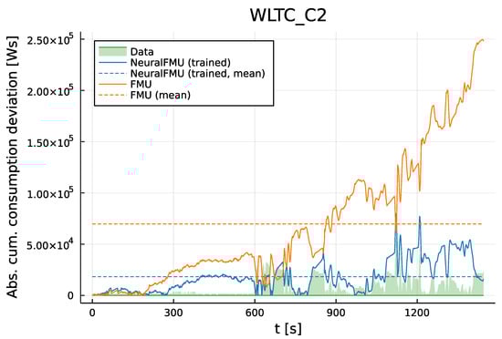 Because longitudinal dynamics models are often used to predict the cumulative consumption on entire cycles, the final value of the solution is especially important and a key factor for model evaluation. Note that this final error of the NeuralFMU is over 8 times smaller on the training data and even 16 times smaller on the validation data. In addition to the final error, the NeuralFMU features a much lower MSE (factor ≈ 63 on training, factor ≈ 16 on testing) and maximum error (factor ≈ 7 on training, factor ≈ 3 on testing), but the simulation time increases about five or six times. This is mainly because of the more expensive event handling inside the hybrid structure and the additional unused performance optimizations in the prototypical implementation. It can be seen that the number of events remains unchanged. The number of adaptive solver steps only slightly increases, which indicates that the average system stiffness hardly changes. Here, an ODE is considered stiff if the adaptive step size of the solver is controlled authoritatively by the stability objective instead of the tolerance objective. Finally, the training is not converged yet and further training epochs or training on more data (e.g., multiple cycles) may reduce the remaining deviations.
