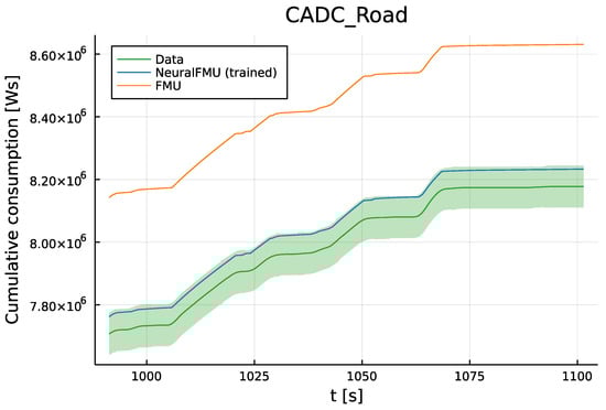 Deviation on the last 10% of the cumulative consumption prediction on the CADC Road, which is part of the training data. The final consumption prediction accuracy of the NeuralFMU (blue) significantly increases compared to the original FMU (orange), lies inside the measurement uncertainty (green, translucent) and close to the data’s mean (green). The original FPM prediction lies completely outside of the measurement uncertainty.