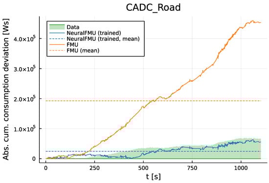 Deviation (absolute error) of the consumption prediction between data and the NeuralFMU (blue) compared to the original FPM/FMU (orange) on the CADC Road, which is part of the training data. After ≈300 s, the NeuralFMU solution lies inside the data uncertainty region (green, translucent) and outperforms the FPM in terms of prediction accuracy. Further, the NeuralFMU error is at any time step significantly smaller than the mean error of the FMU (orange, dashed).