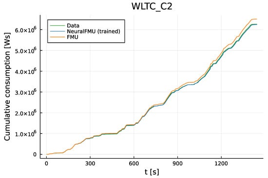 After training, the NeuralFMU is validated against unknown data by simulating another driving cycle, the WLTC Class 2, which is not known from training. This is challenging, because the WLTC Class 2 (mean: m/s, max: m/s) features a very different speed profile compared to the CADC Road (mean: m/s, max: m/s). This especially includes higher velocities that are not part of the training data, which is a good test for the extrapolation capabilities of the hybrid model. Results and explanations can be seen in Figure 13, Figure 14 and Figure 15.