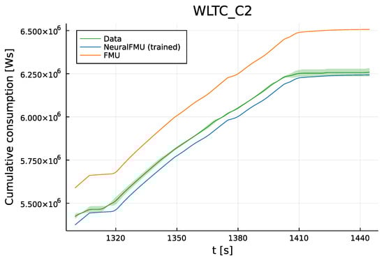 Comparison of the cumulative consumption prediction, using the WLTC Class 2, which is not part of the NeuralFMU training data. As for the training data, the NeuralFMU prediction (blue) is closer to the measurement data mean (green) than the original FPM prediction (orange).