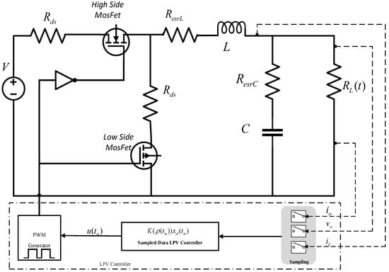 The DC–DC buck power converter studied here with a sampled-data LPV controller is presented in Figure 1. The PWM control approach is utilized to obtain the output voltage regulation by controlling the semiconductor switches, whereas the duty ratio of PWM is adjusted by the digital controller. The DC–DC buck consists of a load resistance , the static drain to source resistances of the power MOSFET , the circuit inductance L, the capacitance C, and equivalent series resistances of the inductor and capacitor . V denotes the time-invariant input voltage. and define the output voltage and inductor current, respectively.