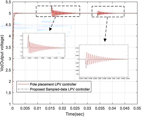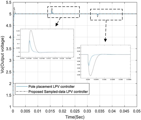 Comparison between output voltage response curves under the proposed controller (T = 0.0002 s) where the load is changed.