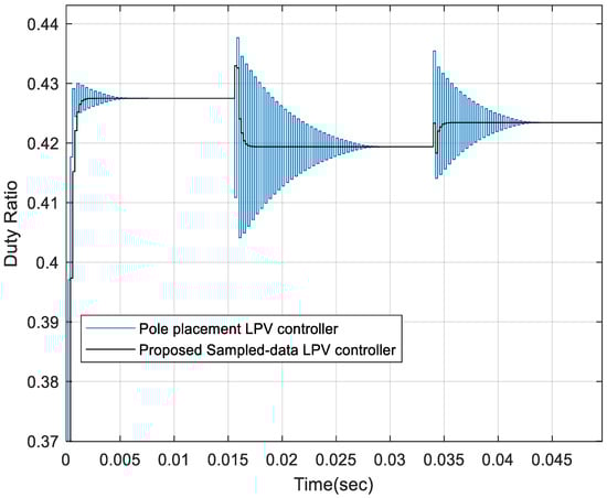 In the simulations, the proposed sampled-data LPV controller is implemented digitally by employing an analog-to-digital sampler and a zero-order hold. When the switching frequency is 200 kHZ, the simulation results for T = 0.0005 s are presented in Figure 2, Figure 3 and Figure 4 where the constant load changes from 5 to 20 and then back to 8 . We compared the proposed sampled-data feedback LPV controller with a regional pole placement LPV technique [30]. Simulation results show that under the duty ratio function shown in Figure 3, the output voltage reaches faster to the steady value, and suitable performance is obtained by the proposed sampled-data feedback LPV controller than the pole placement LPV.