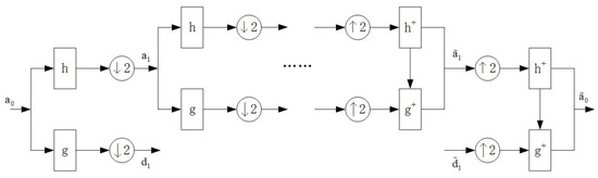 where denotes the impulsive response of the reconstructed low-pass filter and denotes the impulse response of the reconstructed high-pass filter, then the reconstructed equation of Mallat’s algorithm is