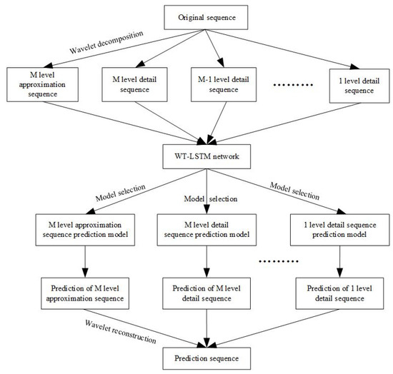 is not yet the final predicted value, the final predicted value is . Then the prediction of the final M-layer approximation sequence is , denoted as . Based on the above calculation, the prediction of the M-layer detail sequence to the 1-layer detail sequence can be obtained in the same way, and is denoted as to . The final prediction can be obtained by reconstructing the above predicted sequence using the wavelet reconstruction algorithm :
