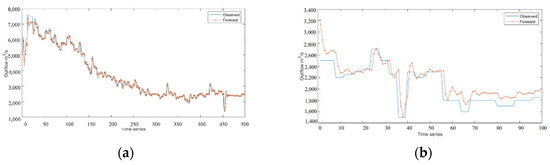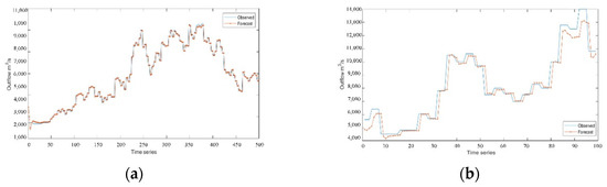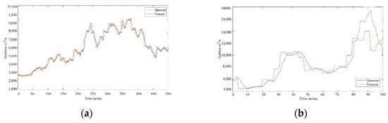 Experimental results of RNN model: (a) training set result in the non-flood season; (b) test set result in the non-flood season.