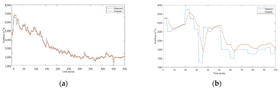 Experimental results of LSTM model: (a) training set result in the non-flood season; (b) test set result in the non-flood season.