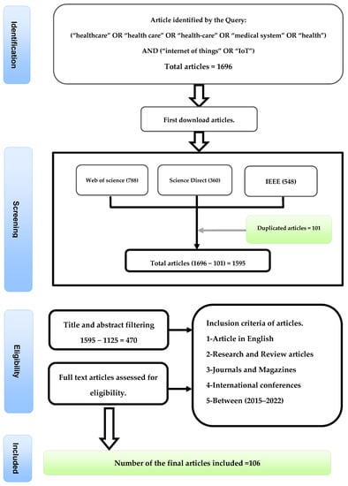 In the identification process, 106 articles were retrieved from three databases: IEEE, Web of Science (WoS), and Science Direct. After eliminating duplicate records and articles with irrelevant topics and abstracts, 470 studies were retained for screening. Upon completing the screening, 207 articles were excluded because they were either irrelevant or full texts were unavailable; 263 relevant articles were retained. All the 263 articles were checked for eligibility and 106 were considered to fulfill the study objective, relevant to the topic, and mentioned either the motivations, challenges, and recommendations for enabling IoT in the healthcare system. It means that 106 studies met the inclusion measures and were selected to be included in this paper (Figure 2).