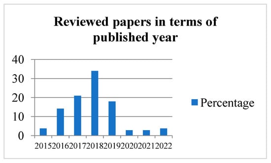 Figure 3 shows the number of studies published between 2015 and 2022 in terms of percentage. Of the studies included in this review, most of them were published in 2018 (n = 35), followed by 2017 (n = 19) and 2019 (n = 19).