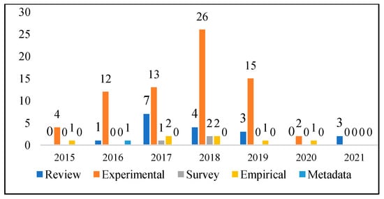 The majority of research articles published from 2016 to 2019 were experimental studies Figure 5, except in 2017, where seven review articles and 13 experimental studies were published. The number of empirical studies was almost equally distributed across each year from 2015 to 2020.