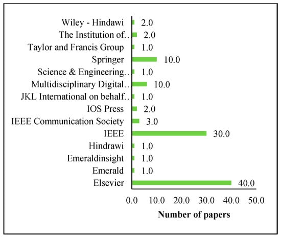 The various publishers of the articles that were considered for this review are outlined in detail in Figure 6 below. Most studies were published by Elsevier (n = 40), followed by IEEE (n = 30) and Springer (n = 10). Less than 10 articles were published by MDPI, IEEE Communication Society, IOS Press, etc.
