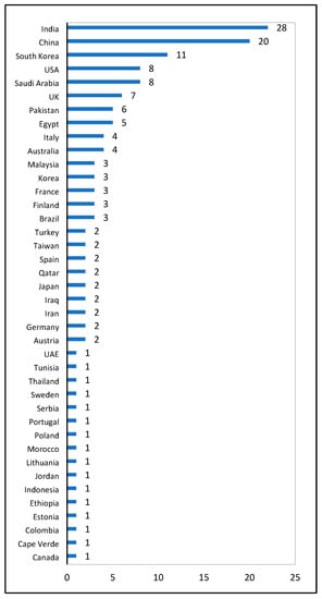 Figure 7 illustrates the distribution of articles depending on the countries in which the research was undertaken. Most of the papers originated from the following countries: India (n = 22), China (n = 20), South Korea (n = 11), the United States (n = 8) and the United Kingdom (6).