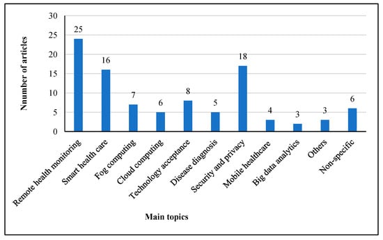 Figure 8 shows the distribution of the articles according to the main topics and research objectives. The majority of the articles focused on remote health monitoring (n = 24), followed by security and privacy (n = 17), smart healthcare (n = 16), technology acceptance (n = 8), and fog computing (n = 7). A total of five articles focused on the application of IoT for disease/medical diagnoses (diabetes, cardiac conditions, hypertension, etc.), whereas less than five articles were based on big data analytics and mobile healthcare. Research topics such as edge computing, living labs, and network layers were classified under “others,” while review articles and studies that were overly broad were classified as “non-specific.”