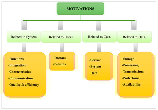 - Motivations related to the main components of healthcare system such as functions, process, integration, properties, resources, quality, and efficiency, communications;