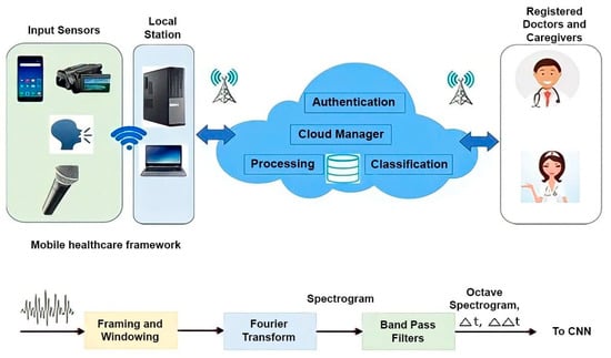 1-Motives related to functions. The potential of combining advanced technology has encouraged many researchers to develop internet of medical things (IoMT) platforms, including in the field of remote monitoring [26,64]. In addition, several reasons that increase the interest in remote monitoring include limited availability of specialist doctors, difficulty in navigating some remote areas, traffic jams, and patients’ being unable to visit the hospital or doctors due to busy schedules [27,46]. For example, a voice pathology detection system on the mobile healthcare framework is proposed. In their proposed framework, sounds are first recorded using smart mobile devices, and the same audio signals are processed before being transmitted to a deep learning network [27]. The proposed remote healthcare system is shown in Figure 10.