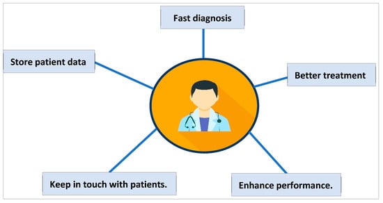 1-Doctors. As demonstrated in Figure 11, using IoT in healthcare systems offers several advantages and benefits to doctors in the performance of their duties. Among the advantages are the best-coordinated care and the storage of patients’ sensitive data, to assist the understanding of their medical history and to deliver fast, accurate diagnosis and treatment [7,18,50,62]. The introduction of intelligent technology in the field of healthcare enables doctors to enhance their performance, improving efficiency and reliability in operations and allowing for subsequent remote monitoring [80,83]. It also promotes communication with patients through the use of specialized software [4,85].