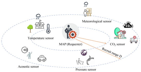 The information requester can assign the crowdsensing task to nearby crowd workers within a short distance sharing a similar spatial-temporal environment and, thus, potentially providing data with a higher reference value to the information requester. Previous field experiments have found that the information requester’s location and the recruiting range have a crucial impact when assigning crowdsensing tasks to the crowd workers [,,,,]. Typically, the crowd workers are interested in participating in nearby crowdsensing tasks that are highly related to themselves, e.g., the reporting of traffic congestion information. They also prefer quick-to-solve crowdsensing tasks with the minimum efforts or resource consumption. The participation in nearby crowdsensing tasks also implies reduced costs in information exchange via wireless communications, which is crucial for low-power and low-cost IoT devices. This motivates the optimization of the information requester’s recruiting range for crowd workers. However, it is complicated by the diverse capabilities of crowd workers in different crowdsensing tasks and the uncertain quality of information provided by them, especially when the crowd workers are mobile devices with unpredictable channel conditions and sensing reliability. In addition, the crowd workers may have different expertise or preferences and, thus, only perform well in specific crowdsensing tasks.