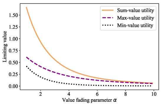 In this part, we numerically evaluate the proposed crowdsensing strategy. The simulation experiments are conducted on AMD R7, 16 GB memory, 3.6 GHz CPU, using Python as the design language. We first illustrate different curves for the value of information and their limiting values at the information requesting. Then, to maximize the value of information in the second part, we are motivated to optimize the optimal recruiting parameters, including the waiting time and recruiting range for crowd workers. We also verify the general gradient-based approach for utility maximization, considering the aging effect in the value of information at the information requester. The constant parameter ℓ defined in (1) denotes the sensor node’s reliability in the crowdsensing task. We assume for all sensor nodes and focus on the heterogeneity of the computing and communication environments. We set to denote the spatial correlation of information at different locations. The weight parameter denotes the unit price paid to each active sensor node.