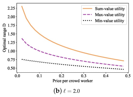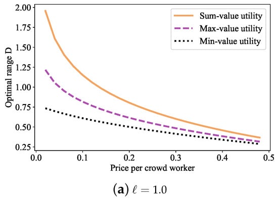 As the recruiting range D increases, the information requester’s utilities show a similar trend in different cases, i.e., the utilities firstly increase and then decrease. The monotonicity of the utility curves is difficult to analyze. However, we can observe that there is an optimal recruiting range for the information requester to achieve its maximum utility. When the recruiting range is beyond the optimal value, the information requester’s utility begins to decrease with D gradually. The reason is that the delay for data transmission will be significant and the costs paid to all crowd workers also become excessive when the recruiting range is too large. Considering the spatial correlation in the value of information, a distant crowd worker will have poor data quality and thus less value of information. Therefore, by increasing the recruiting range, the information requester will obtain little payoff from the distant crowd workers but still pay the same price. This implies the diminishing utility as the recruiting range increases. The sum-value utility is risk neutral and, thus, it cumulates all crowd workers’ information. Therefore, we observe that the sum-value utility achieves the highest value of information compared with the max- and min-value utilities in Figure 5. To observe the effect of the parameter ℓ on the data quality function, Figure 6 shows that when the value of ℓ is larger, the variation range of the optimal range D also increases. Then, the gap between the optimal ranges D of the three different cases also increases. From this we can see that the parameter ℓ has a significant impact on the distance sensitivity.