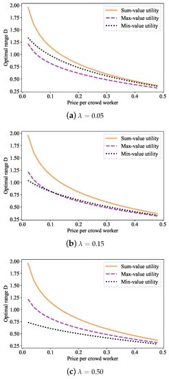 In addition, the max-value utility is higher than that of the min-value utility. An interesting observation is that the optimal recruiting range in the max-value utility is not necessarily larger than that corresponds to the min-value utility. Figure 7 compares the optimal recruiting range with different utilities and unit prices c paid to each crowd worker. It shows that the optimal range for the sum-value utility is the largest one, compared to the max- and min-value utilities. The optimal recruiting range for the min-value utility is generally less than that for the max-value utility. However, we can find that, when lambda is less than or equal to 0.15, the optimal recruiting range for the max-value utility is less than that for the min-value utility. As the unit price c increases, the optimal recruiting ranges in all cases are decreasing. A higher price c implies that the information requester will be more cautious to increase its recruiting range due to the decreasing payoff obtained from distant crowd workers.