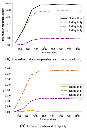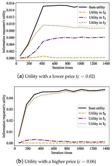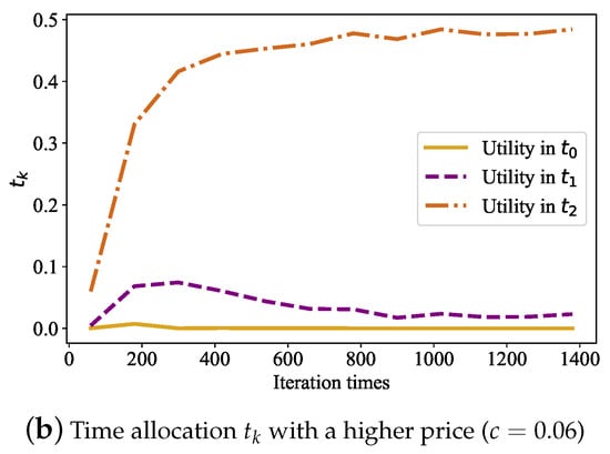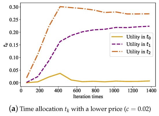In Figure 10, we compare the sum-value utility with different prices paid to the crowd workers. The convergence to the stable value is assured for different prices. Correspondingly, Figure 11 shows the dynamics of time allocation with different prices. When we set the constant price to , we can see that gradually decreases and approaches 0 at the convergence, as shown in Figure 11a. Conversely, the time allocation and slowly grows up and reaches its maximum as the number of iterations increases. However, we will have very different observations when we set a larger price to . As shown in Figure 10b, the overall sum-value utility is dominated by the last time slot , while the sum-value utilities accumulated in and become insignificant. Correspondingly, the time allocations in and are neglectable, as shown in Figure 11b. We can see that the adjustment of the crowd workers’ unit price affects the information requester’s optimal time allocation strategy. Our algorithm proposed in this paper can dynamically adjust the time allocation strategy according to different prices so that the utility can converge to its maximum value.