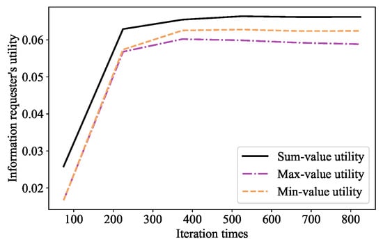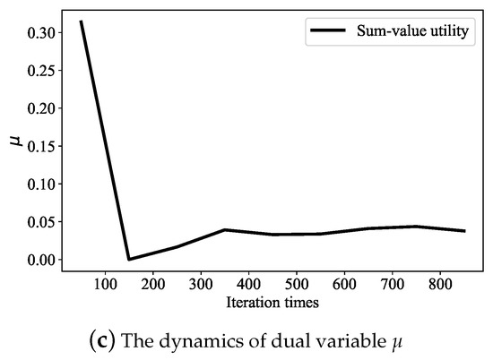 Figure 8a shows the evolution of the sum-value utility in the iterative process. The x-coordinate denotes the time steps in iteration. We also plot the sum-value utility obtained in each time slot. The overall sum-value utility is the superposition of the utilities in all time slots. This allows us to examine the contribution of different time slots. We can observe that the sum-value utility converges to a relatively stable value after 300 iteration times. Correspondingly, the time slot in each time slot and the dual variable also converge, as shown in Figure 8b,c, respectively. At the convergence, the stochastic gradient for each time slot is close to zero. This result verifies the conclusion in Proposition 7 that the gradients for all time slots are identical to some constant. When the condition in Proposition 7 holds, there is no need to further improve the overall utility by adjusting the size of the different time slots. At the convergence, the dual multiplier approaches zero, as shown in Figure 8c. Once the sum of all time allocations becomes greater than the limit T, the value of will start to increase. This acts as the penalty term to the sum-value utility, ensuring a feasible time allocation strategy at the convergence. In Figure 9, we compare the evolution of sum-value utility with that of the max- and the min-value utilities. We observe that at the convergence the sum-value utility achieves a higher value than the other two cases, which corroborates the observation in Figure 4.
