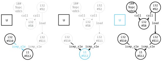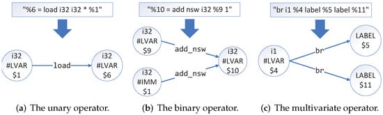 For zero-element operators, such as alloca and ret, since there is no data flow information transfer, they can be ignored directly. For the unary operators, we take “%6 = load i32 i32 * %1” as an example, and its data flow transformation is shown in Figure 2a. For binary operators, we take “%10 = add nsw i32 %9 1” as an example, and its data flow transformation is shown in Figure 2b. For multivariate operators, we take “br i1 %4 label %5 label %11” as an example, and its data flow transformation is shown in Figure 2c. In addition, Table 1 lists the corresponding categories of all operators in LLVM IR.